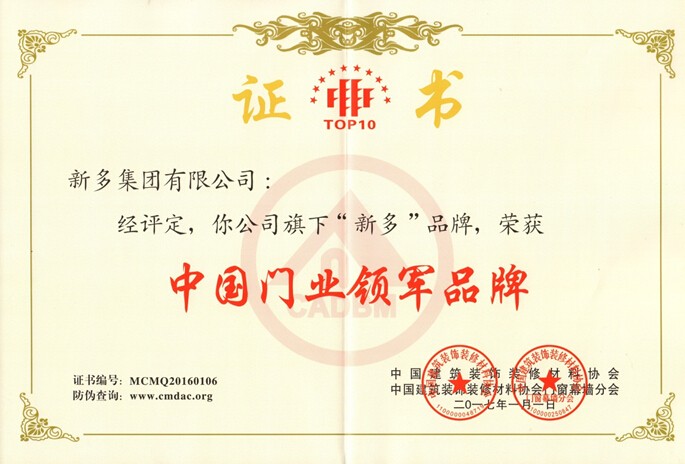 新多集團22年來,專注造門,只造好門,以“精雕細(xì)琢,精益求精”的產(chǎn)品贏得了無數(shù)廣大消費者的喜愛,創(chuàng)造出一個又一個的市場奇跡。新多曾先后榮獲“國家高新技術(shù)企業(yè)”、“中國門業(yè)十大品牌”、“中國門業(yè)十大白金獎”、“全國防火門十強企業(yè)”、“浙江省著名商標(biāo)”、“500強房產(chǎn)首選品牌”、“康居產(chǎn)品認(rèn)證”、“浙江省專利示范企業(yè)”、“中國公共安全產(chǎn)品認(rèn)證”等無數(shù)榮譽。眾多的榮譽既是對新多集團輝煌成就的見證,更是新多人超越自我、再創(chuàng)輝煌的新起點。